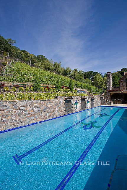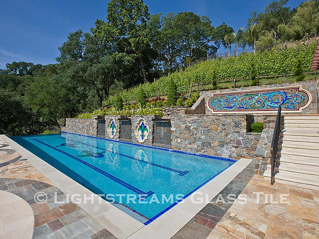 The fleur de lys glass tile medallions on the pool floor and on the elevated wall above the pool are a design by Lightstreams Glass Tile Designer, David Knox. The medallions consist of various patterns of Lightstreams Jewel Glass, and all the glasses for each medallion are hand-cut.