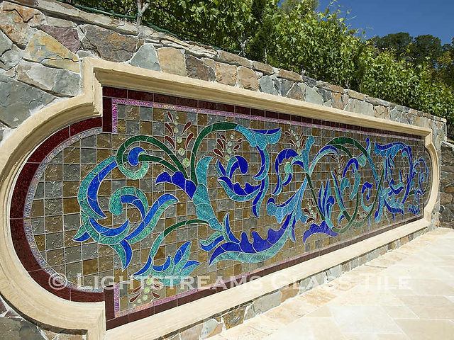 The gorgeous custom designed glass tile mural above the elevated spa consists of various patterns of Lightstreams Jewel Accent Glass. The mural is a creation by Lightstreams Glass Designer, David Knox, and all the floral and curved glasses in the mural are hand-cut.
