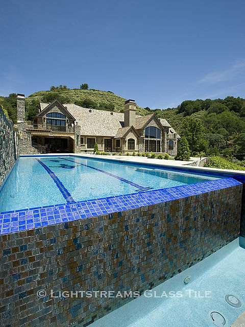 American maufactured Lightstreams Glass Tiles are the exclusive tile products in this sweeping San Francisco Bay Area swimming pool. Please scroll down this page for more photographs and information on the various Lightstreams Glass Tiles used in this custom swimming pool design.