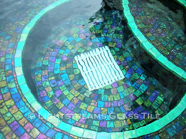 American-manufactured Renaissance Collection Dark Silver (grey) glass iridescent tiles clad this smaller scale all-tile pool and raised spa. The pool and spa steps are edged with Lightstreams Renaissance Collection Celadon green glass tile 90 degree bent trim tiles.