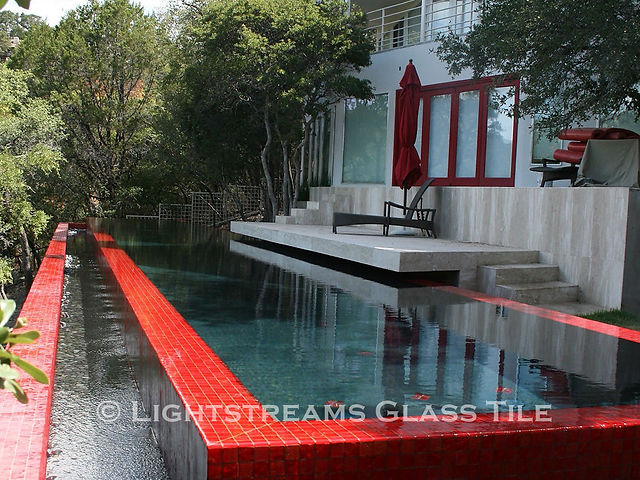 Renaissance Collection Chinese Red Iridescent Glass Swimming Pool Tiles provide a striking yet clean finish on this modern all glass tile swimming pool in Texas. The bold red glass tiles and minimalist pool design create an amazingly graceful look in the very natural setting.