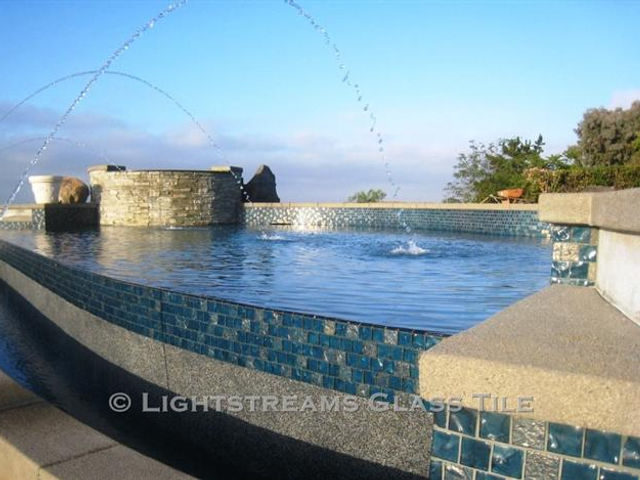 Lightstreams Gold Iridescent Steel Blue glass tiles are used in this beautiful infinity edge swimming pool at a private residence in San Diego, California.