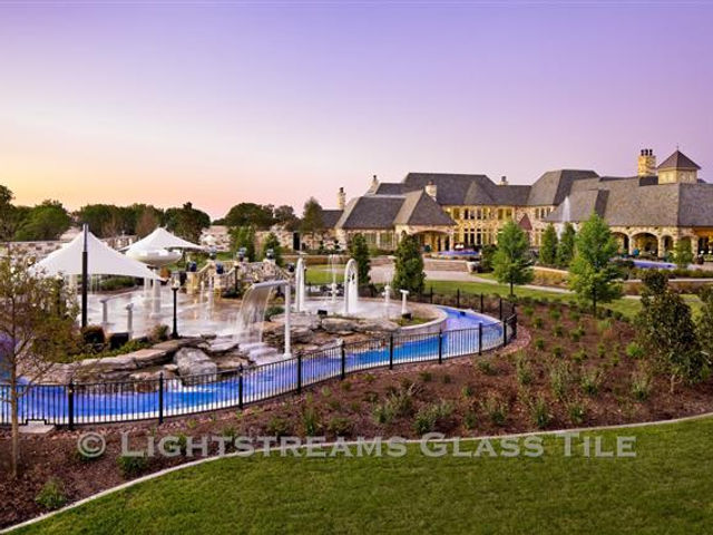 An outdoor circular fountain is also tiled with Lightstreams Renaissance Collection Sky Blue 2"x2" glass tiles.