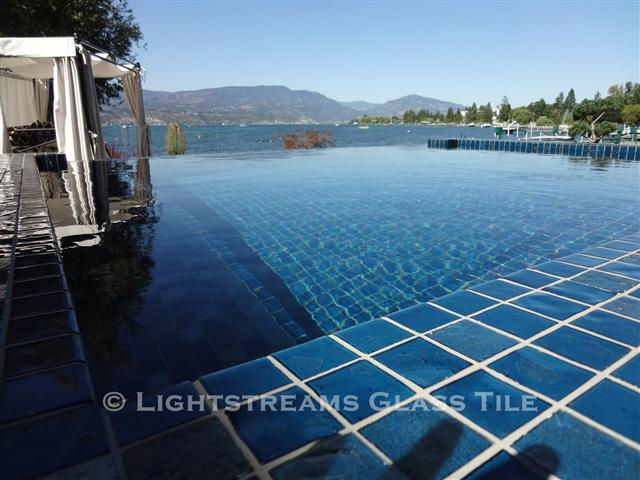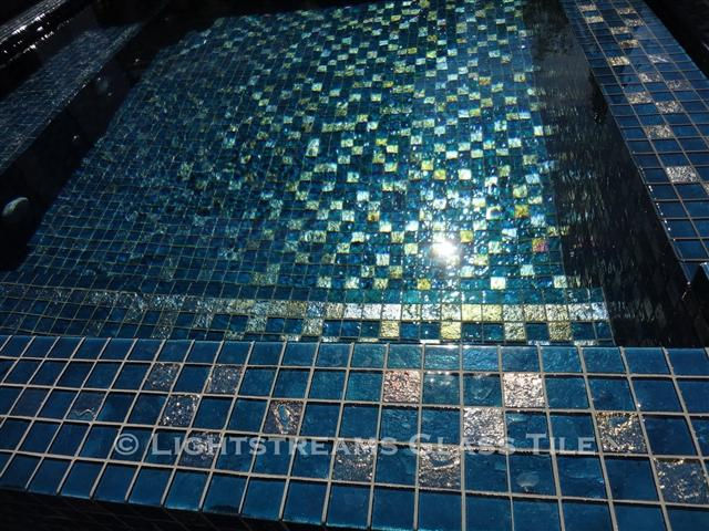 Lightstreams Gold Iridescent Collection Steel Blue 2"x2" glass swimming pool and spa tile is used in this beautiful waterfront all glass tile spa.