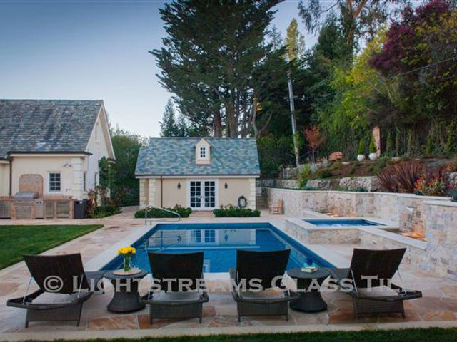 The all-tiled pool steps are embellished with Lightstreams Secret Garden 2"x2" Jewel glass accent tiles which function as pool step markers, but are also exquisitely beautiful and unique.