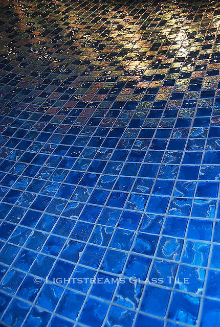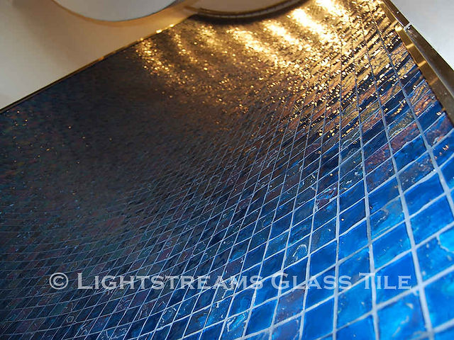 This dramatic 3-story glass tiled wet wall is tiled with American manufactured Lightsteams Renaissance Collection Peacock Blue iridescent glass tiles. The gorgeous blue glass tiles have colorful iridescent colors on the textured side of the reversible tile, and the glass tiles were installed in a random blend of both sides of the tiles.