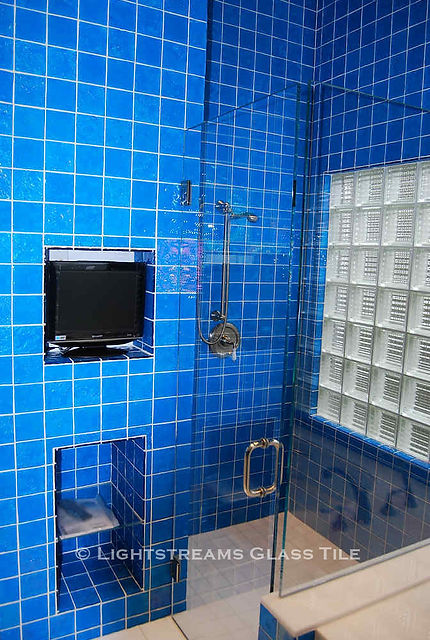 American manufactured Lightstreams Renaissance Collection Turquoise blue iridescent glass tiles are used in the beautiful all-glass tile bathroom and shower in this Monterey Peninsula residence.