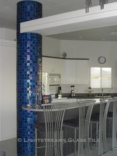 Lightstreams Renaissance Collection 2x2 Peacock blue iridescent glass tiles make a striking color statement on these interior columns in the kitchen of this Southern California private residence.