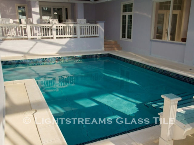 In this lovely swimming pool in the Bahamas, Renaissance Collection Peacock Iridescent Glass Swimming Pool Tile is used as waterline tile and pool step markers. Lightstreams Jewel Glass Accent Tiles Shell Beach is used to accent the pool.