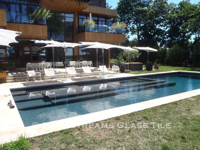 In this lovely swimming pool, Lightstreams Gold Iridescent Collection Silverado Iridescent Glass Swimming Pool Tile is used as waterline tile and step marker tile. It is also used for the all glass tile spa using all iridescent side up to enhance the borders edges.