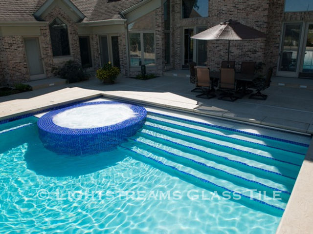 Renaissance Collection Intense Blue Iridescent Glass Swimming Pool Tile is used as waterline tile and step marker tile. It is also used for this beautiful glass tile spa.
