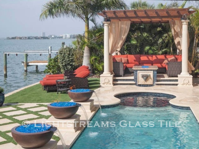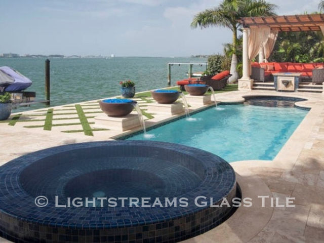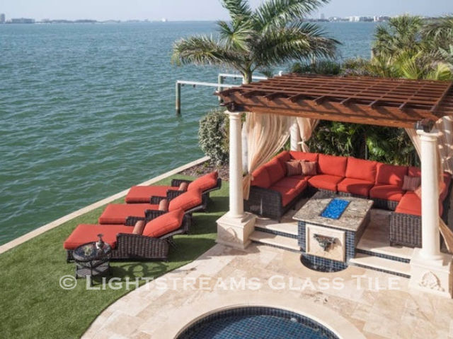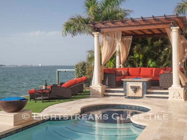 In this beautiful swimming pool in Florida, Gold Iridescent Collection Steel Blue Iridescent Glass Swimming Pool Tile is used for the pools waterline, fountain and bonfire tile, all glass tile spa, and as accent tiles for the barbecue area backsplash .
