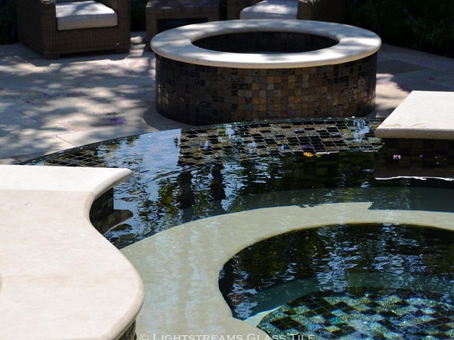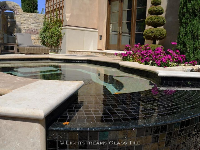 Lightstreams Gold Iridescent Collection Obsidian Black was used for this lovely all glass tile spa located in Northern California.