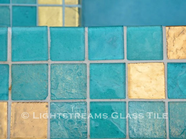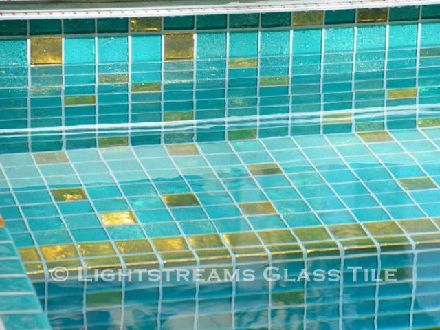 In this beautiful swimming pool and spa in Northern California, Renaissance Collection Aquamarine and Lightstreams 24k Gold Accent tile is used to make this dynamic glass mosaic design.