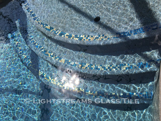 Lightstreams Gold Iridescent Collection Steel Blue Glass Tile was used for this pools waterline, step markers, and all glass tile spa.
