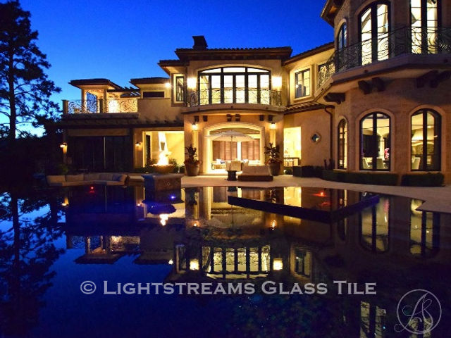 This all glass tile pool in British Columbia is tiled with Lightstreams Renaissance Collection Peacock Blue Glass Tile