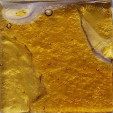 High quality American made Lightstreams Gold Iridescent Collection Amber glass tiles are a golden caramel / tan color on the shiny side of the tile, with metallic iridescent colors on the reverse side.