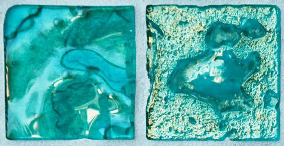 High quality American made Lightstreams Gold Iridescent Collection Aquamarine glass tiles are a beautiful blue / green / aqua color on the shiny side of the tile, with metallic iridescent colors on the reverse side.