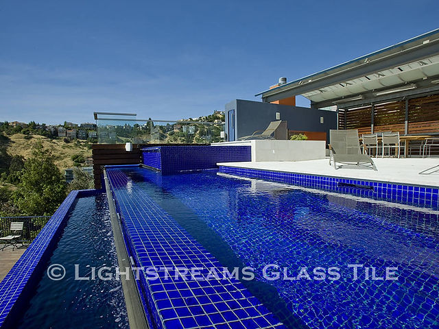 American manufactured Lightstreams Renaissance Collection Royal Blue glass pool tiles clad this ultra-modern infinity edge all-tile swimming pool in Berkeley, California.