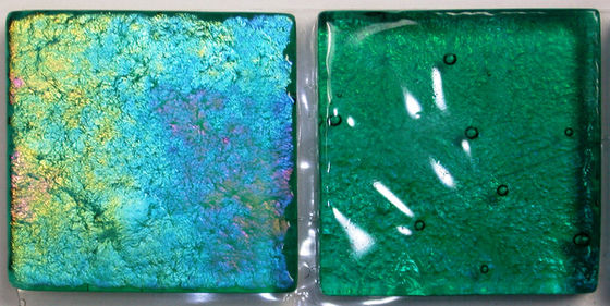 High quality American-made Lightstreams Renaissance Collection Celadon Green glass tiles are a soft earth-tone sage green. There are subtle rainbow iridescent colors on the reverse textured side of the tile.