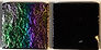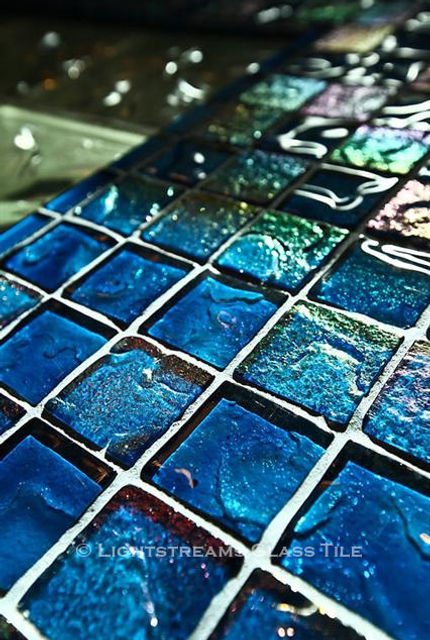 High quality American-made Lightstreams Renaissance Collection Peacock glass tiles are a deep jewel-tone blue / green color on one side, with rich rainbow iridescent colors on the reverse textured side.