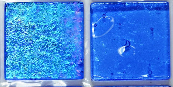 High quality American-made Lightstreams Renaissance Collection Sky Blue glass tiles are a light blue (baby blue / robin egg's blue) with a hint of lilac (not quite periwinkle). There are subtle rainbow iridescent colors on the reverse textured side.